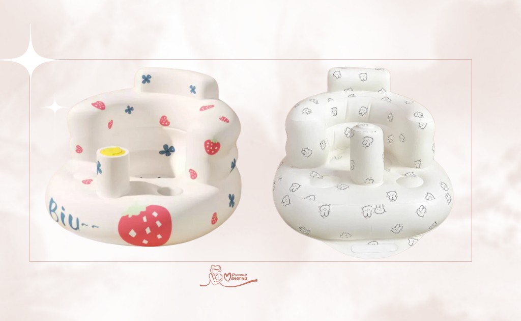 O formato anatômico oferece apoio para as costas e ajuda o bebê a se manter sentado com mais segurança. O material inflável é macio ao toque, proporcionando uma experiência confortável tanto no chão quanto na água.