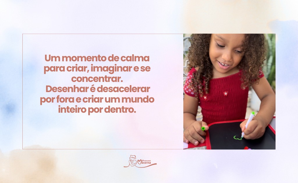 O momento do desenho convida à calma e à atenção. A criança se envolve na atividade e exercita a capacidade de se concentrar por mais tempo.