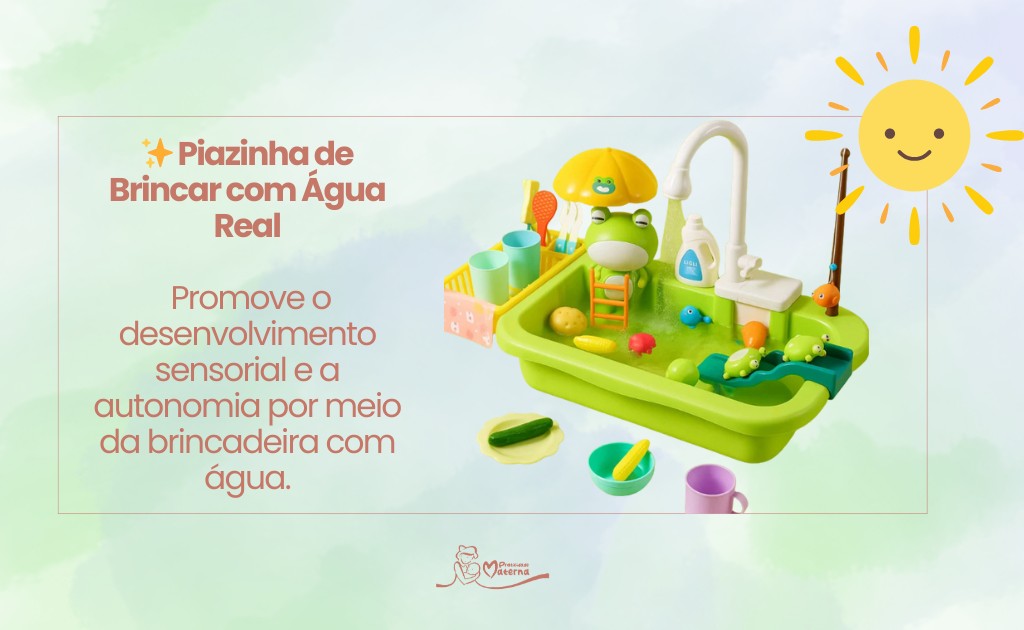 As piazinhas apresentadas neste post são: Piazinha de Brincar, Montar, Lavar e Brincar, Piazinha de Brincar com Água Real e Pia Mágica Infantil — todas pensadas para oferecer água de verdade, incentivar a autonomia e transformar o brincar em aprendizado nos dias de verão.