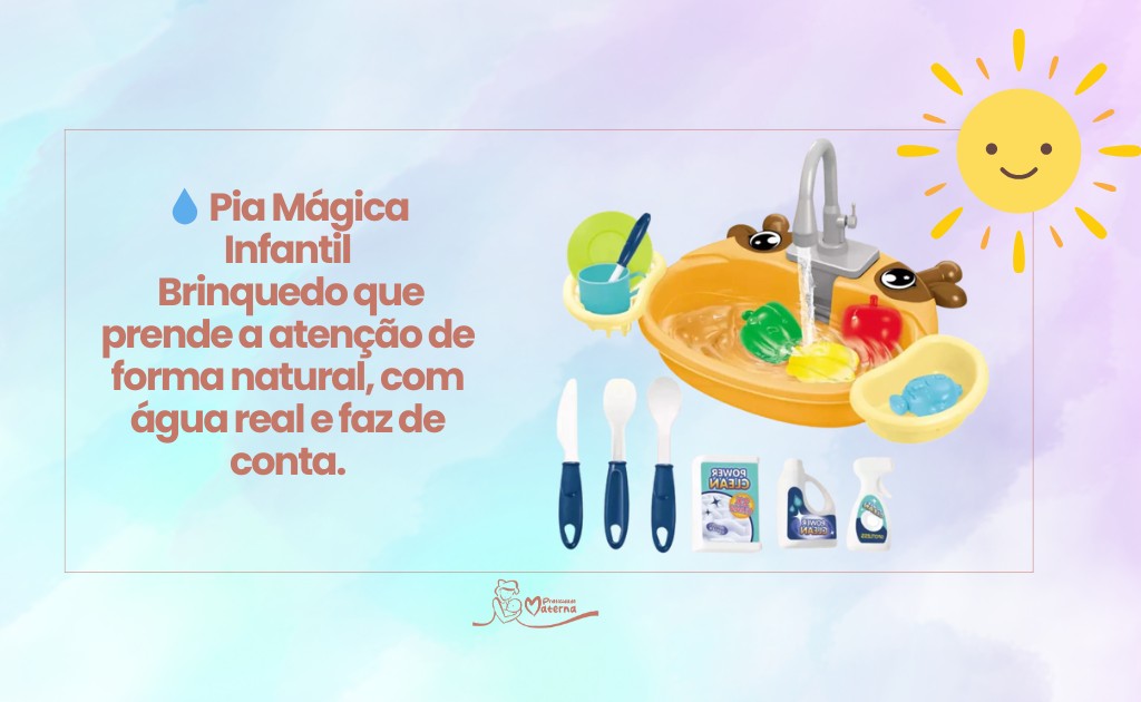 Para fechar esta sequência de piazinhas com água real, temos mais uma versão da Pia Mágica Infantil, com foco especial em brincadeira segura e envolvente, perfeita para aqueles dias em que você deseja oferecer uma atividade significativa e longe das telas.