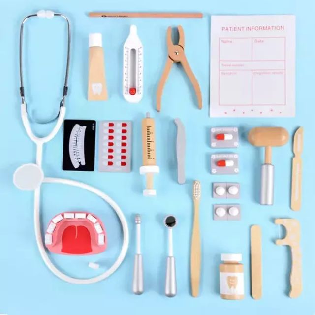Conjunto completo de ferramentas odontológicas de madeira para brincadeira