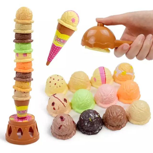 As peças foram projetadas para que a criança empilhe, combine sabores e crie “sorvetes” do jeitinho dela.