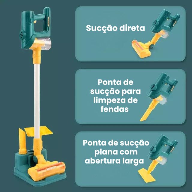 O Mini Aspirador Faz de Conta imita de forma realista um aspirador de verdade, com luzes, som e até compartimento para "poeirinha" — do jeitinho que as crianças adoram!