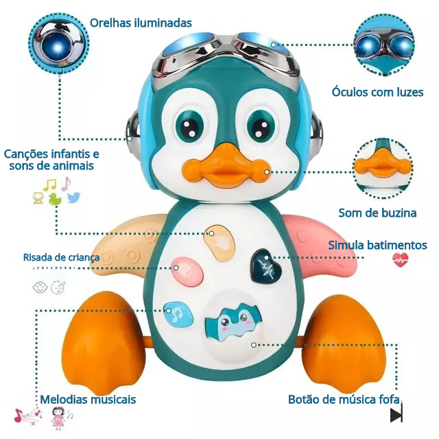 O Pinguim do Som Mágico é um brinquedo educativo e interativo que encanta com luzes, sons e movimentos, incentivando seu bebê a engatinhar, explorar e sorrir sem parar!